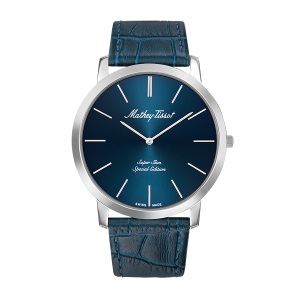 Silver-tone stainless steel 316L case with a blue leather strap. Fixed silver-tone bezel. Blue dial with silver-tone hands and index hour markers. Dial Type: Analog. Ronda Caliber 1032 quartz movement. Scratch resistant sapphire crystal. Pull / push crown. Stainless steel 316L case back. Round case shape, case size: 42 mm, case thickness: 6 mm. Buckle clasp. Water resistant at 30 meters / 100 feet. Functions: hour, minute. Cyrus Series. Watch label: Swiss Made. Mathey-Tissot Cyrus Quartz Blue Dial Mens Watch H6915ABU.