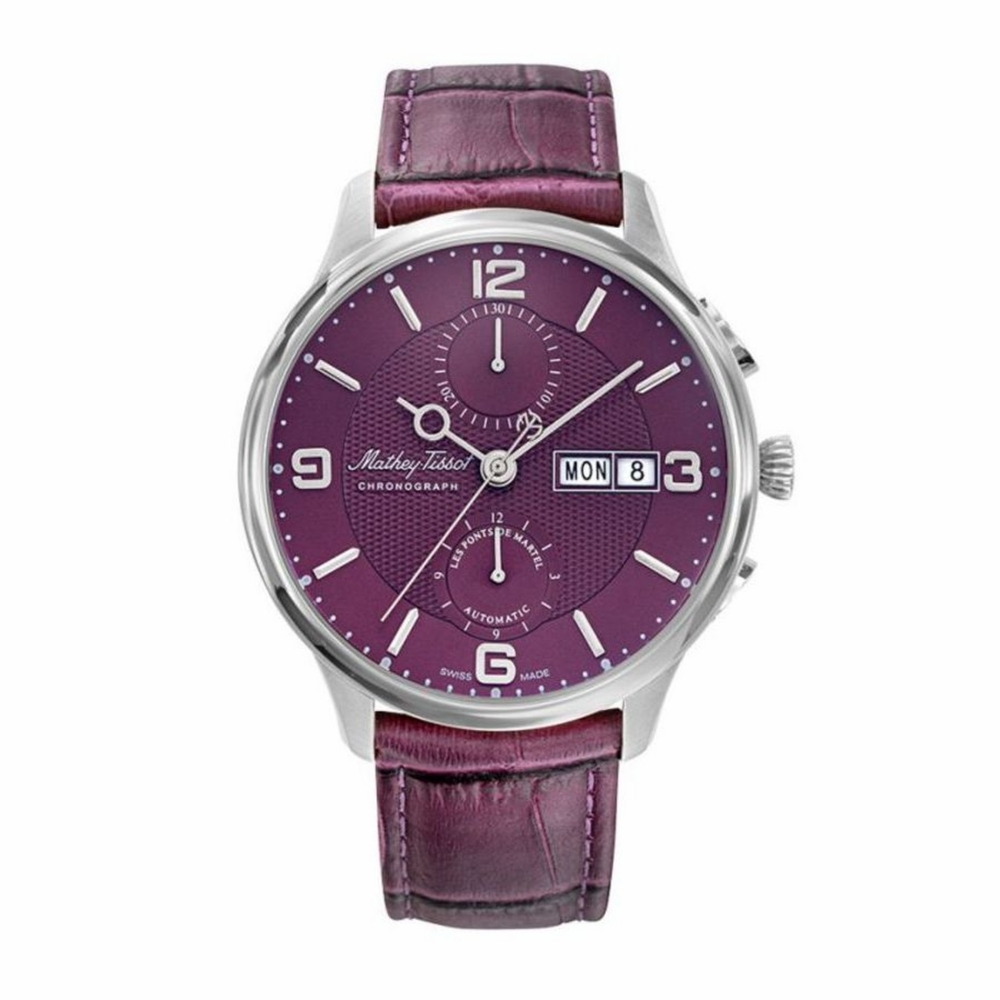 Stainless steel case with a purple leather strap. Fixed stainless steel bezel. Purple dial with silver-tone hands and index hour markers. Arabic numerals appear atthe 3, 6, 9 and 12 o'clock positions. Minute markers around the outer rim. Dial Type: Analog. Day of the week and date display at the 3 o'clock position. Chronograph - two sub-dials displaying: 30 minutes and 12 hours. Landeron 77 automatic movement. Scratch resistant mineral crystal. Pull / push crown. Transparent case back. Round case shape. Case size: 42 mm. Case thickness: 13 mm. Butterfly clasp. Water resistant at 50 meters / 165 feet. Functions: chronograph, day, date, hour, minute, second. Additional Info: dome glass. Edmond Chrono Automatic Series. Casual watch style. Watch label: Swiss Made. Mathey-Tissot Edmond Chrono Automatic Chronograph Purple Dial Mens Watch H1886CHATAR.