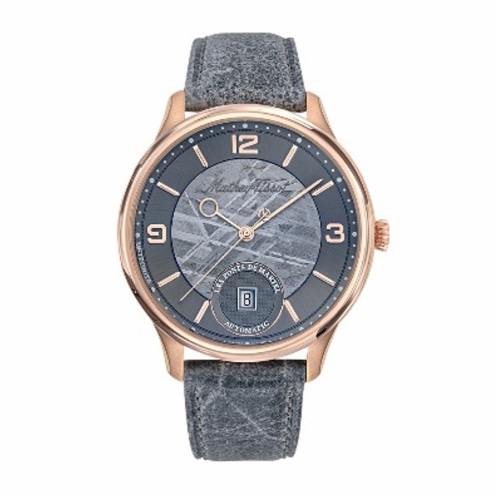 Rose gold-tone stainless steel 316L case with a grey leather strap. Fixed rose gold-tone stainless steel bezel. Muonionalusta meteorite dial with rose gold-tone hands and index-Arabic numeral hour markers. Minute markers around the outer rim. Dial Type: Analog. Date display at the 6 o'clock position. Sellita Caliber SW 200-1 Automatic movement, based upon Sellita SW 200, containing 26 Jewels, bitting at 28800 vph, and has a power reserve of approximately 38 hours. Scratch resistant sapphire crystal. Pull / push crown. Transparent see through case back. Round case shape, case size: 42 mm, case thickness: 11 mm. Water resistant at 50 meters / 165 feet. Functions: date, minute, second. Edmond Meteorite Series. Watch label: Swiss Movt. Mathey-Tissot Edmond Meteorite Automatic Mens Watch H1886METP.