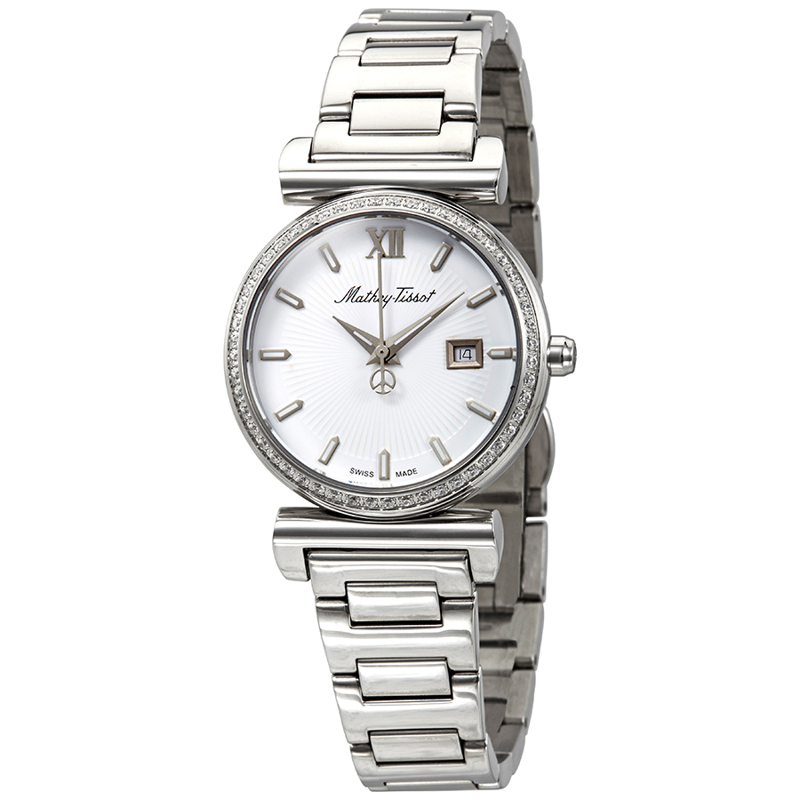 Stainless steel case with a stainless steel bracelet. Fixed stainless steel set with diamonds bezel. Silver dial with silver-tone hands and index hour markers. A Roman numeral appears at the 12 o'clock position. Dial Type: Analog. Luminescent hands and markers. Date display at the 3 o'clock position. Ronda caliber 585 quartz movement. Scratch resistant sapphire crystal. Pull / push crown. Solid case back. Round case shape. Case size: 32 mm. Case thickness: 8 mm. Butterfly clasp. Water resistant at 50 meters / 165 feet. Functions: date, hour, minute, second. Additional Info: 52 diamonds hsi 0,3 ct. Dress watch style. Watch label: Swiss Movt. Mathey Tissot Elegance Diamond Silver Dial Ladies Watch D410AQI.