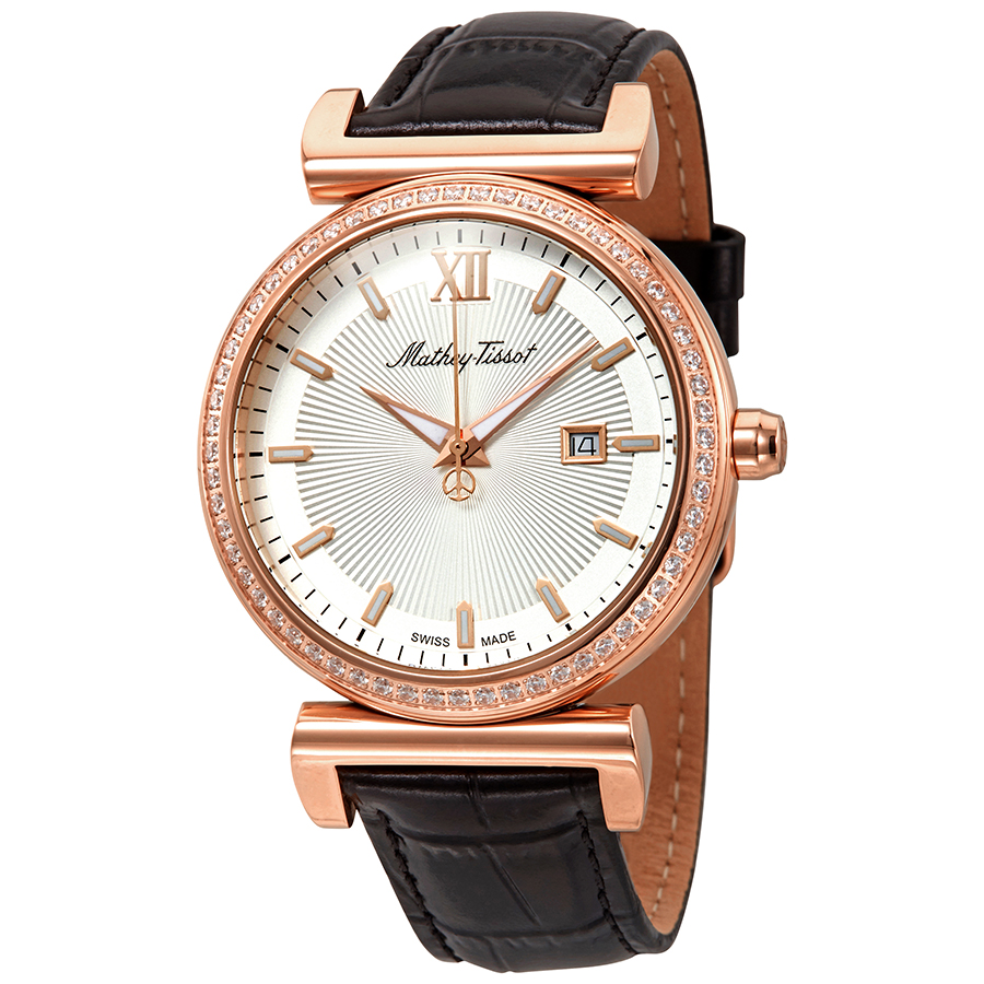 Rose gold PVD stainless steel case with a black leather strap. Fixed rose gold PVD bezel set with diamonds. White dial with luminous rose gold-tone hands and index hour markers. A Roman numeral appears at the 12 o'clock position. Minute markers around the outer rim. Dial Type: Analog. Luminescent hands and markers. Date display at the 3 o'clock position. Ronda Caliber 505 quartz movement. Scratch resistant sapphire crystal. Pull / push crown. Solid case back. Round case shape. Case size: 42 mm. Case thickness: 10 mm. Tang clasp. Water resistant at 50 meters / 165 feet. Functions: date, hour, minute, second. Dress watch style. Watch label: Swiss Movt. Mathey-Tissot Elegance Diamond White Dial Mens Watch H410PLQI.