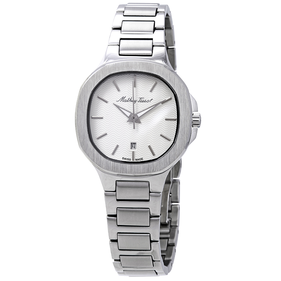 Stainless steel case with a stainless steel bracelet. Fixed stainless steel bezel. Silver dial with luminous silver-tone hands and index hour markers. Dial Type: Analog. Luminescent hands. Date display above the 6 o'clock position. Quartz movement. Scratch resistant sapphire coated crystal. Pull / push crown. Solid case back. Pillow case shape. Case size: 32 mm. Case thickness: 8 mm. Band width: 16 mm. Butterfly clasp. Water resistant at 50 meters / 165 feet. Functions: date, hour, minute, second. Evasion Series. Casual watch style. Watch label: Swiss Made. Mathey-Tissot Evasion Silver Dial Ladies Watch D152AI.