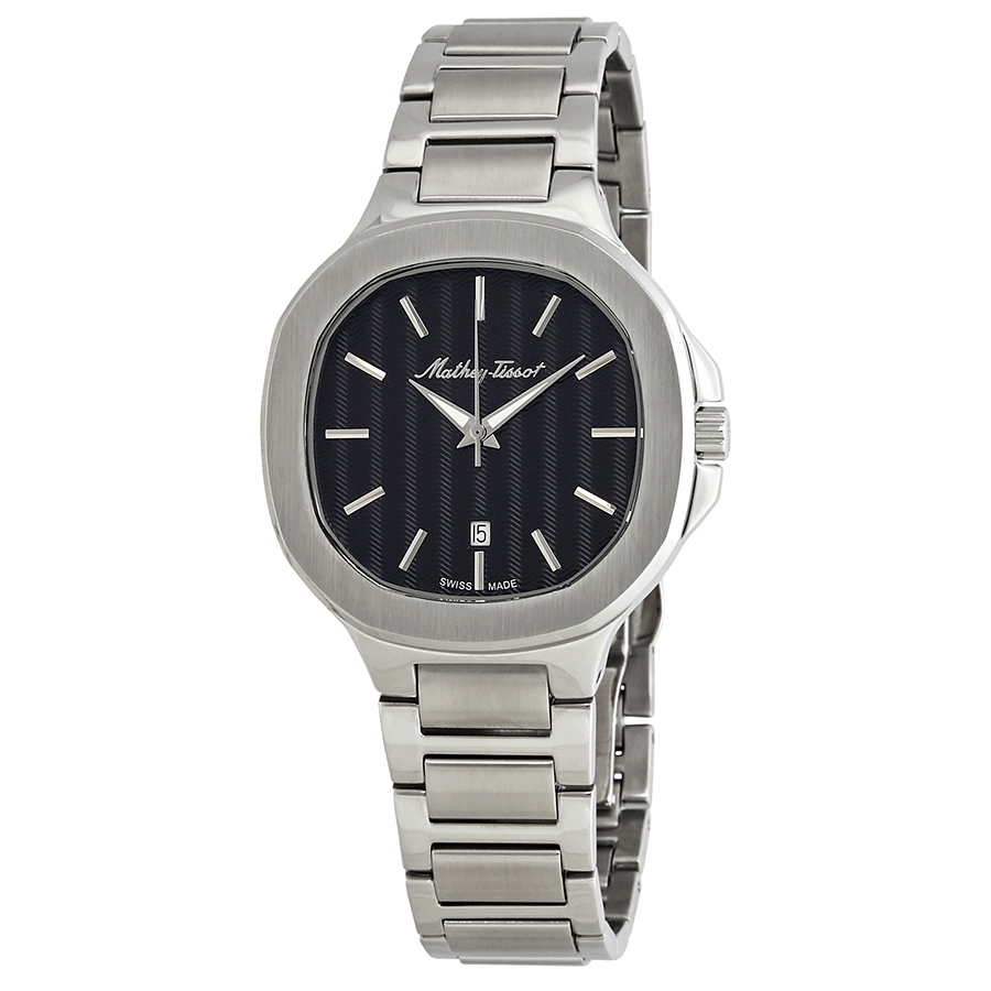 Stainless steel case with a stainless steel bracelet. Fixed stainless steel bezel. Black dial with luminous silver-tone dauphine-style shape hands and index hour markers. Dial Type: Analog. Luminescent hands. Date display at the 6 o'clock position. Ronda caliber 505 quartz movement. Scratch resistant sapphire crystal. Pull / push crown. Solid case back. Cushion case shape. Case size: 42 mm. Case thickness: 8 mm. Butterfly clasp. Water resistant at 50 meters / 165 feet. Functions: date, hour, minute, second. Casual watch style. Watch label: Swiss Made. Mathey-Tissot Evasion Black Dial Mens Watch H152AN.
