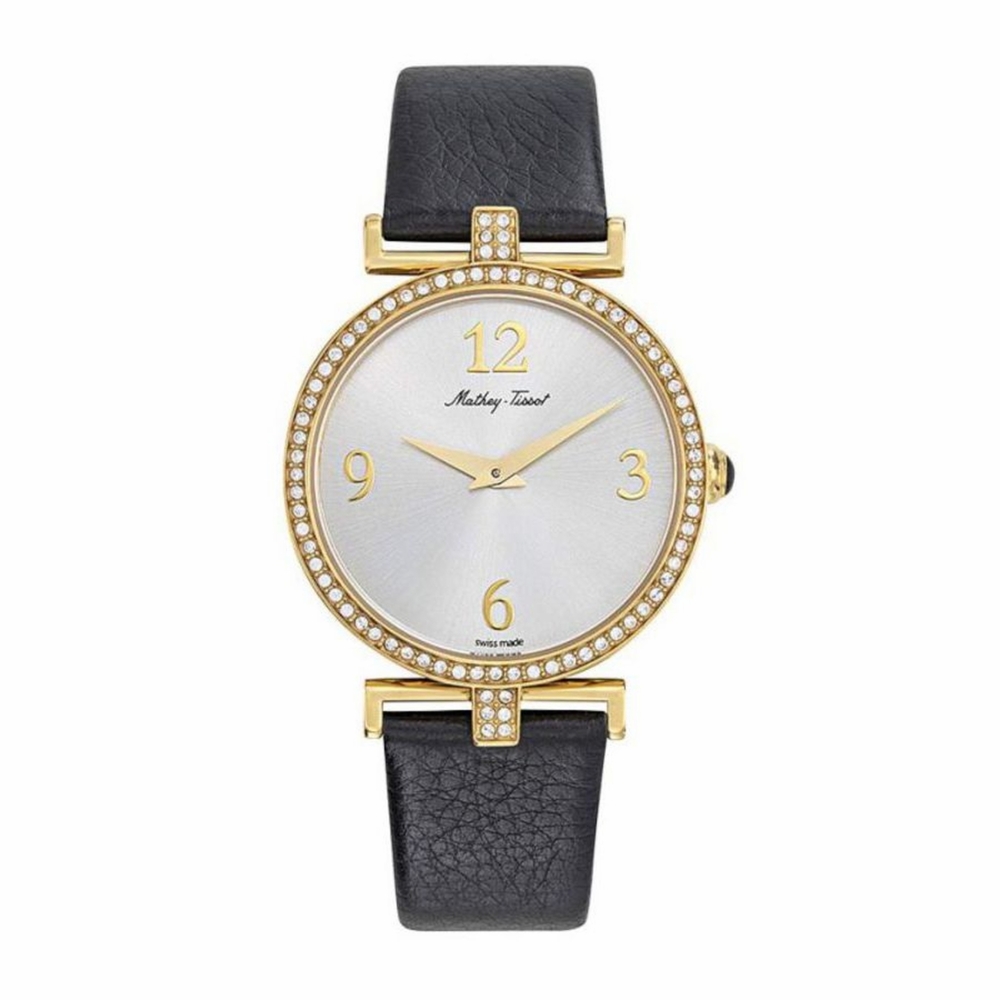Yellow gold-tone stainless steel case with a black genuine leather strap. Fixed yellow gold-tone stainless steel bezel. Silver-tone dial with yellow gold-tone hands and Arabic numeral hour markers. Dial Type: Analog. Ronda Caliber 762 quartz movement. Scratch resistant mineral crystal. Pull / push crown. Solid case back. Round case shape, case size: 34 mm. Tang clasp. Water resistant at 50 meters / 165 feet. Functions: hour, minute. Additional Info: zirconia. Gaia Series. Casual watch style. Watch label: Swiss Made. Mathey-Tissot Gaia Quartz Silver Dial Ladies Watch D587QPYI.