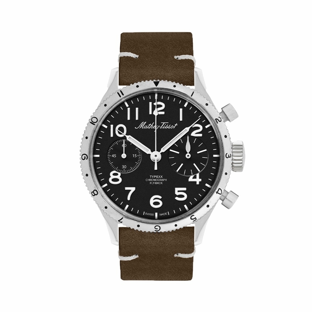 Silver-tone stainless steel case with a brown leather strap. Bi-directional rotating silver-tone stainless steel bezel. Black dial with silver-tone hands and Arabic numeral hour markers. Minute markers around the outer rim. Dial Type: Analog. Automatic movement. Scratch resistant sapphire crystal. Pull / push crown. Solid case back. Round case shape, case size: 38.5 mm. Functions: chronograph, hour, minute, second. Homage Type Xx Series. Casual watch style. Watch label: Swiss Made. Mathey-Tissot Homage Type XX Chronograph Automatic Black Dial Mens Watch TYPEXXAR.