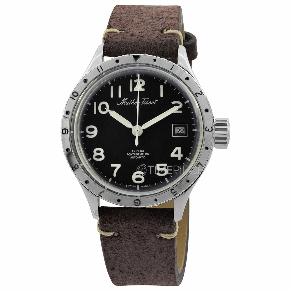 Stainless steel case with a brown leather strap. Bi-directional rotating stainless steel bezel. Black dial with luminous silver-tone hands and Arabic numeral hour markers. Minute markers around the outer rim. Dial Type: Analog. Luminescent hands and markers. Date display at the 3 o'clock position. Automatic movement. Scratch resistant sapphire crystal. Pull / push crown. Transparent case back. Round case shape. Case size: 38 mm. Case thickness: 14.6 mm. Tang clasp. Water resistant at 50 meters / 165 feet. Functions: date, hour, minute, second. Homage Type Xx Series. Casual watch style. Watch label: Swiss Made. Mathey-Tissot Homage Type XX Black Dial Mens Watch TYPEXXAT.