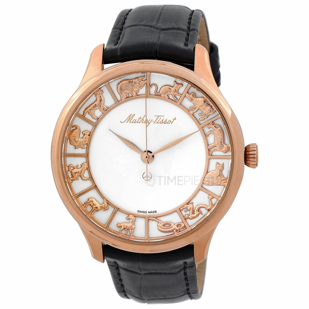 Rose gold-tone stainless steel case with a black genuine leather strap. Fixed rose gold-tone stainless steel bezel. White dial with rose gold-tone hands. Dial Type: Analog. STP Caliber STP1-11 Automatic movement, based upon ETA 2824-2, containing 26 Jewels, bitting at 28800 vph, and has a power reserve of approximately 44 hours. Scratch resistant sapphire crystal. Pull / push crown. Transparent case back. Round case shape, case size: 42 mm. Fold over with double push button release clasp. Water resistant at 50 meters / 165 feet. Functions: hour, minute, second. Additional Info: zodiac signs markers. Limited Edition Zodiac Series. Dress watch style. Watch label: Swiss Made. Mathey-Tissot Limited Edition Zodiac Automatic White Dial Mens Watch H1866PI2.