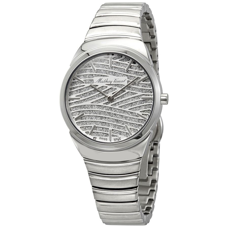 Stainless steel case with a stainless steel bracelet. Fixed stainless steel bezel. Spangled silver dial with silver-tone hands and index hour markers. Dial Type: Analog. Ronda caliber 762 quartz movement. Scratch resistant sapphire crystal. Pull / push crown. Solid case back. Round case shape. Case size: 32 mm. Case thickness: 3 mm. Band width: 18 mm. Deployment clasp with a push button release. Water resistant at 50 meters / 165 feet. Functions: hour, minute. Mandy Series. Dress watch style. Watch label: Swiss Movt. Mathey-Tissot Mandy Quartz Spangled Silver Dial Ladies Watch D1091AIS.