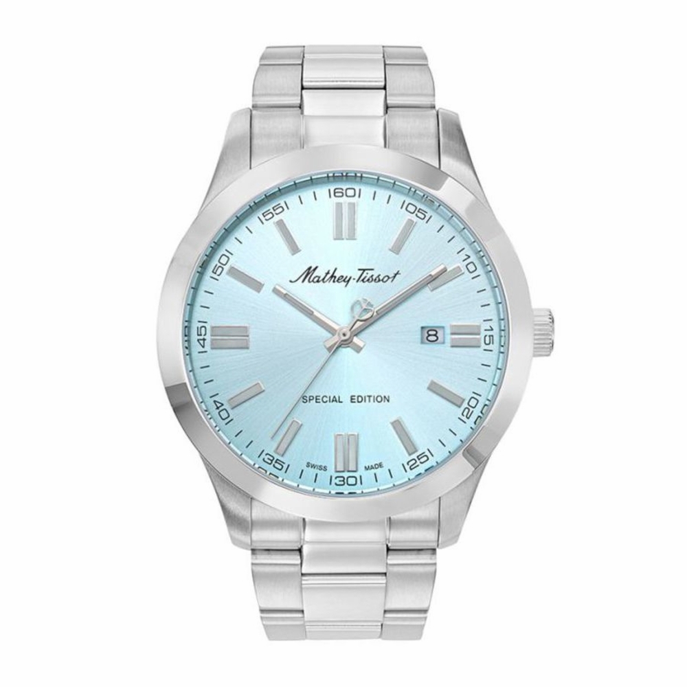 Silver-tone stainless steel case and bracelet. Fixed silver-tone stainless steel bezel. Blue dial with silver-tone hands and index hour markers. Minute markers around the outer rim. Dial Type: Analog. Luminescent hands. Date display at the 3 o'clock position. Ronda Caliber 515 H3 quartz movement. Scratch resistant mineral crystal. Pull / push crown. Solid case back. Round case shape, case size: 44 mm. Fold over clasp with a safety release. Water resistant at 50 meters / 165 feet. Functions: date, hour, minute, second. Mathy I Jumbo Series. Casual watch style. Watch label: Swiss Made. Mathey-Tissot Mathy I Jumbo Quartz Blue Dial Mens Watch H455SK.