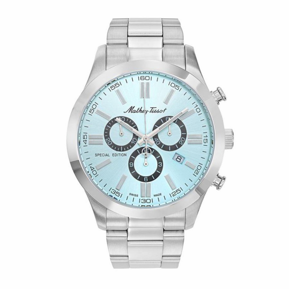 Silver-tone stainless steel case and bracelet. Fixed silver-tone stainless steel bezel. Blue dial with silver-tone hands and index hour markers. Minute markers around the outer rim. Dial Type: Analog. Luminescent hands. Date display at the 4 o'clock position. Chronograph - three sub-dials displaying: 60 second, 30 minute and 12 hour. Ronda Caliber 5030.D quartz movement. Scratch resistant mineral crystal. Pull / push crown. Solid case back. Round case shape, case size: 44 mm. Fold over clasp with a safety release. Water resistant at 50 meters / 165 feet. Functions: chronograph, date, hour, minute, small second. Mathy I Jumbo Chrono Series. Casual watch style. Watch label: Swiss Made. Mathey-Tissot Mathy I Jumbo Chrono Chronograph Quartz Blue Dial Mens Watch H455CHSK.