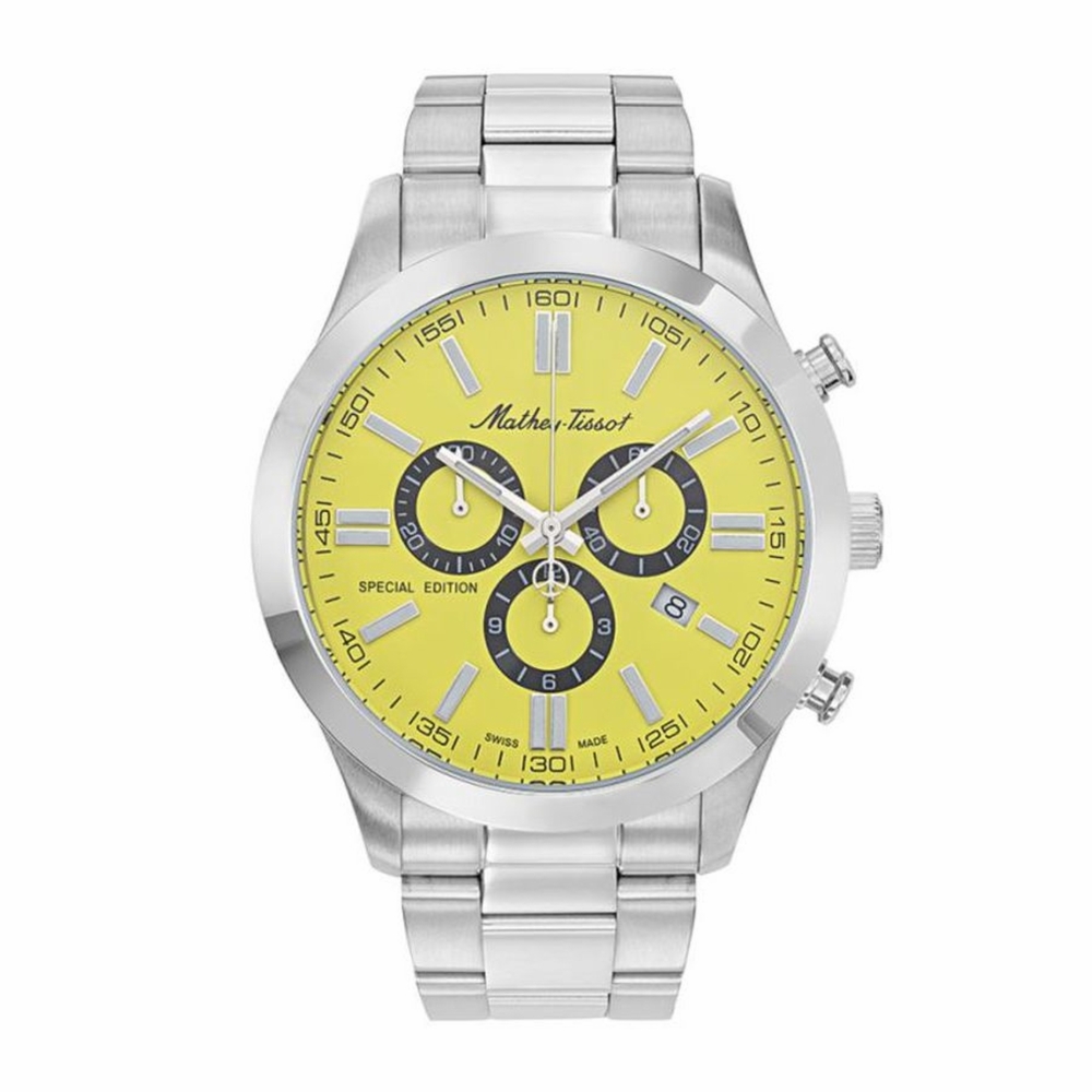 Silver-tone stainless steel case and bracelet. Fixed silver-tone stainless steel bezel. Yellow dial with silver-tone hands and index hour markers. Minute markers around the outer rim. Dial Type: Analog. Luminescent hands. Date display at the 4 o'clock position. Chronograph - three sub-dials displaying: 60 second, 30 minute and 12 hour. Ronda Caliber 5030.D quartz movement. Scratch resistant mineral crystal. Pull / push crown. Solid case back. Round case shape, case size: 44 mm. Fold over clasp with a safety release. Water resistant at 50 meters / 165 feet. Functions: chronograph, date, hour, minute, small second. Mathy I Jumbo Chrono Series. Casual watch style. Watch label: Swiss Made. Mathey-Tissot Mathy I Jumbo Chrono Chronograph Quartz Mens Watch H455CHJ.