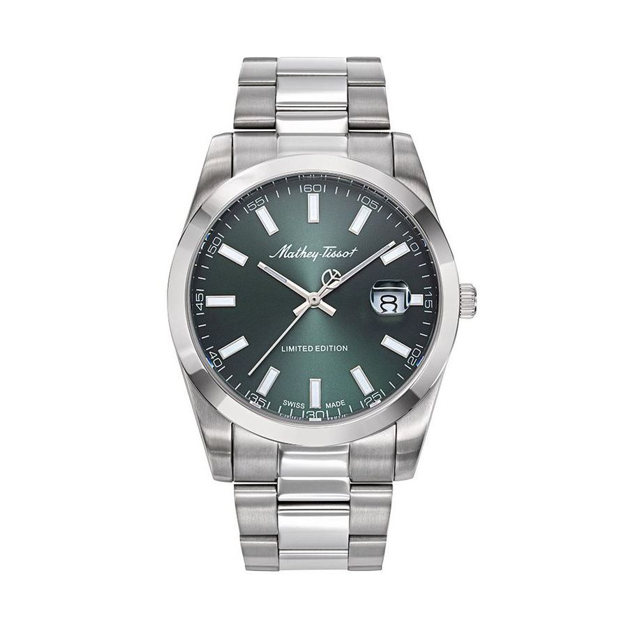 Silver-tone stainless steel case and bracelet. Fixed silver-tone stainless steel bezel. Green dial with silver-tone hands and index hour markers. Minute markers around the outer rim. Dial Type: Analog. Luminescent hands and markers. Date display at the 3 o'clock position. Ronda Caliber 505 quartz movement. Scratch resistant mineral crystal. Pull / push crown. Solid case back. Round case shape, case size: 42 mm. Fold over clasp. Functions: date, hour, minute, second. Mathy I Le Series. Casual watch style. Watch label: Swiss Made. Mathey-Tissot Mathy I LE Quartz Green Dial Mens Watch H451VE.