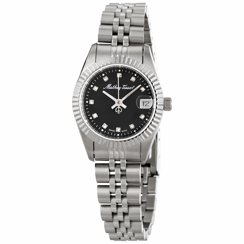 Silver-tone stainless steel case with a silver-tone stainless steel bracelet. Fixed bezel. Black dial with silver-tone hands. Dial Type: Analog. Date display at the 3 o'clock position. Quartz movement. Scratch resistant mineral crystal. Pull / push crown. Solid case back. Round case shape, case size: 26 mm, case thickness: 3 mm. Fold over with safety release clasp. Water resistant at 50 meters / 165 feet. Functions: date, hour, minute, second. Watch label: Swiss Made. Mathey-Tissot Mathy II Quartz Black Dial Ladies Watch D710AN.