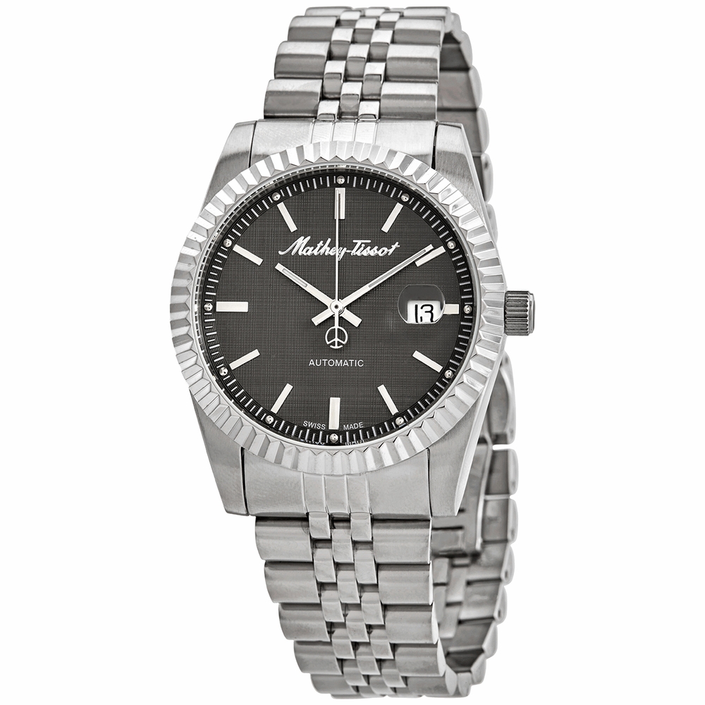 Silver-tone stainless steel case and bracelet. Fixed silver-tone stainless steel bezel. Grey dial with luminous silver-tone hands and index hour markers. Minute markers around the outer rim. Dial Type: Analog. Luminescent hands and markers. Date display at the 3 o'clock position. STP Caliber STP1-11 Automatic movement, based upon ETA 2824-2, containing 26 Jewels, bitting at 28800 vph, and has a power reserve of approximately 44 hours. Scratch resistant antireflex sapphire crystal. Pull / push crown. Transparent case back. Round case shape, case size: 42 mm, case thickness: 9 mm. Band width: 20 mm. Fold over clasp with a safety release. Water resistant at 50 meters / 165 feet. Functions: date, hour, minute, second. Mathy IIi Series. Casual watch style. Watch label: Swiss Made. Mathey-Tissot Mathy III Automatic Grey Dial Mens Watch H1810ATAS.