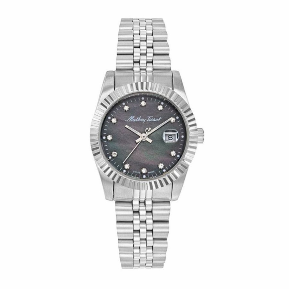 Silver-tone stainless steel case and bracelet. Fixed silver-tone stainless steel bezel. Black dial with silver-tone hands and index hour markers. Minute markers around the outer rim. Dial Type: Analog. Luminescent hands and markers. Date display at the 3 o'clock position. Ronda Caliber 585 H6 quartz movement. Scratch resistant mineral crystal. Pull / push crown. Solid case back. Round case shape, case size: 32 mm. Fold over clasp. Water resistant at 50 meters / 165 feet. Functions: date, hour, minute, second. Additional Info: zirconia. Mathy IIi Mop Series. Casual watch style. Watch label: Swiss Made. Mathey-Tissot Mathy III MOP Quartz Black Dial Ladies Watch D910AN.