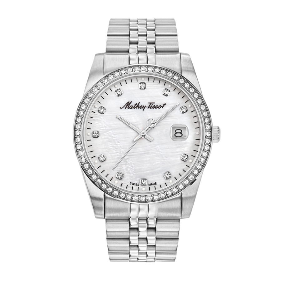 Silver-tone stainless steel case and bracelet. Fixed silver-tone stainless steel bezel. Black dial with silver-tone hands and index hour markers. Minute markers around the outer rim. Dial Type: Analog. Luminescent hands and markers. Date display at the 3 o'clock position. Ronda Caliber 505 quartz movement. Scratch resistant mineral crystal. Pull / push crown. Solid case back. Round case shape, case size: 42 mm, case thickness: 5 mm. Deployment with push button release clasp. Water resistant at 50 meters / 165 feet. Functions: date, hour, minute, second. Mathy IV Series. Fashion watch style. Watch label: Swiss Made. Mathey-Tissot Mathy IV Quartz Black Dial Mens Watch H709AQI.