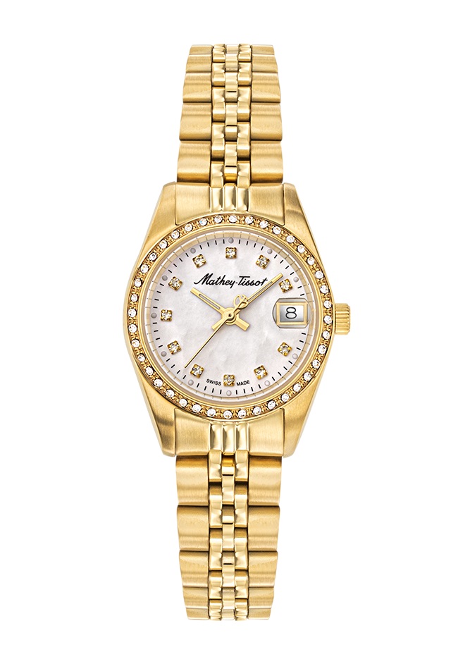 Yellow gold-tone stainless steel 316L case and bracelet. Fixed yellow gold-tone bezel. Mother of pearl dial with yellow gold-tone hands and index hour markers. Minute markers around the outer rim. Dial Type: Analog. Luminescent hands and markers. Date display at the 3 o'clock position. Ronda caliber 585 H3 quartz movement. Scratch resistant mineral crystal. Pull / push crown. Solid case back. Round case shape. Case size: 26 mm. Case thickness: 3 mm. Deployment clasp. Water resistant at 50 meters / 165 feet. Functions: date, hour, minute, second. Additional Info: zirconia index and zirconia on the bezel. Mathy IV Series. Fashion watch style. Watch label: Swiss Made. Mathey-Tissot Mathy IV Quartz Ladies Watch D709PQI.