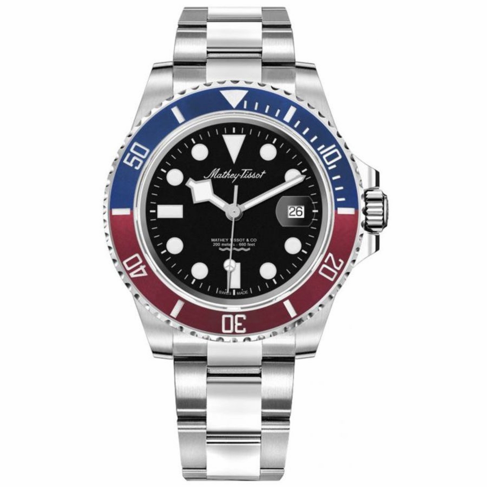 Stainless steel case with a stainless steel bracelet. Uni-directional rotating stainless steel bezel with an inlaid blue and red ceramic ring. Black dial with luminous silver-tone hands and dot hour markers. Minute markers around the outer rim. Dial Type: Analog. Luminescent hands and markers. Date display at the 3 o'clock position. Ronda caliber 515 quartz movement. Scratch resistant mineral crystal. Screw down crown. Solid case back. Round case shape. Case size: 43 mm. Case thickness: 12 mm. Fold over clasp. Water resistant at 200 meters / 660 feet. Functions: date, hour, minute, second. Jumbo Series. Casual watch style. Watch label: Swiss Made. Mathey-Tissot Jumbo Quartz Black Dial Mens Watch H9060AR.