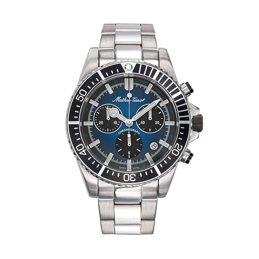 Silver-tone stainless steel case and bracelet. Uni-directional rotating black stainless steel bezel. Blue dial with silver-tone hands and index hour markers. Minute markers around the outer rim. Dial Type: Analog. Luminescent hands and markers. Date display between 4 and 5 o'clock position. Chronograph - three sub-dials displaying: 60 second, 30 minute and 12 hour. Ronda Caliber 5030.D quartz movement. Scratch resistant mineral crystal. Screw down crown. Solid case back. Round case shape, case size: 42 mm. Fold over clasp. Water resistant at 100 meters / 330 feet. Functions: chronograph, date, hour, minute, small second. Mathy Strike Series. Casual watch style. Watch label: Swiss Made. Mathey-Tissot Mathy Strike Chronograph Quartz Blue Dial Mens Watch H908CHABU.