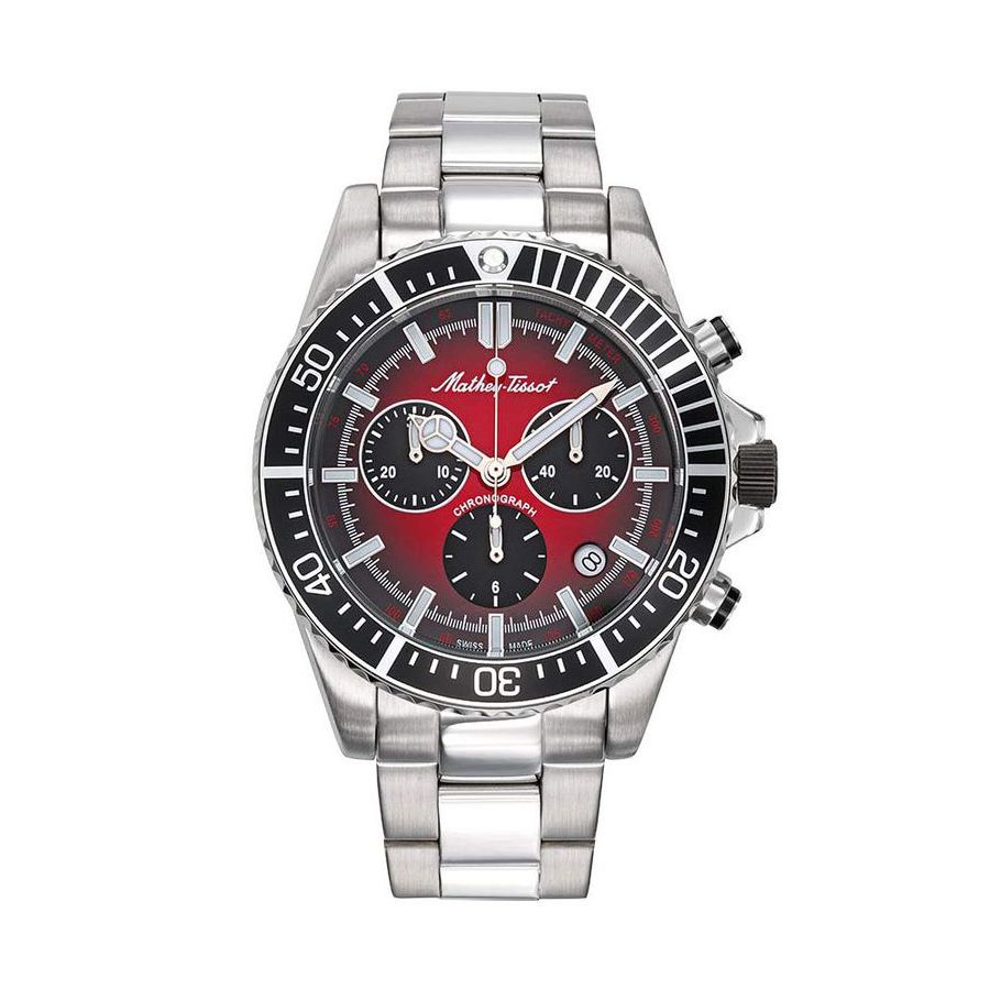 Stainless steel case with a stainless steel bracelet. Uni-directional rotating stainless steel bezel with an inlaid black. bezel. Red dial with luminous silver-tone hands and index hour markers. Minute markers around the outer rim. Dial Type: Analog. Luminescent hands and markers. Date display between the 4 and 5 o'clock positions. Chronograph - three sub-dials displaying: 60 second, 30 minute and 12 hour. Ronda caliber 5030.D quartz movement. Scratch resistant mineral crystal. Screw down crown. Solid case back. Round case shape. Case size: 42 mm. Fold over clasp. Water resistant at 100 meters / 330 feet. Functions: chronograph, date, hour, minute, small second. Mathy Strike Series. Casual watch style. Watch label: Swiss Made. Mathey-Tissot Mathy Strike Chronograph Quartz Red Dial Mens Watch H908CHAR.