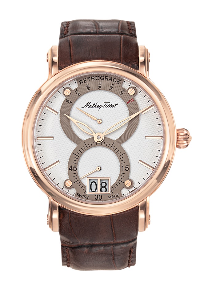 Rose gold-tone stainless steel case with a brown genuine leather strap. Fixed rose gold-tone stainless steel bezel. White dial with rose gold-tone hands and index hour markers. Minute markers around the outer rim. Dial Type: Analog. Date display at the 6 o'clock position. Day of the week subdials. Ronda Caliber 7004P quartz movement. Scratch resistant sapphire crystal. Pull / push crown. Solid case back. Round case shape, case size: 43 mm. Deployment with push button release clasp. Water resistant at 50 meters / 165 feet. Functions: date, hour, minute, second. Retrograde 1886 Series. Fashion watch style. Watch label: Swiss Made. Mathey-Tissot Retrograde 1886 Quartz White Dial Mens Watch H7022PI.