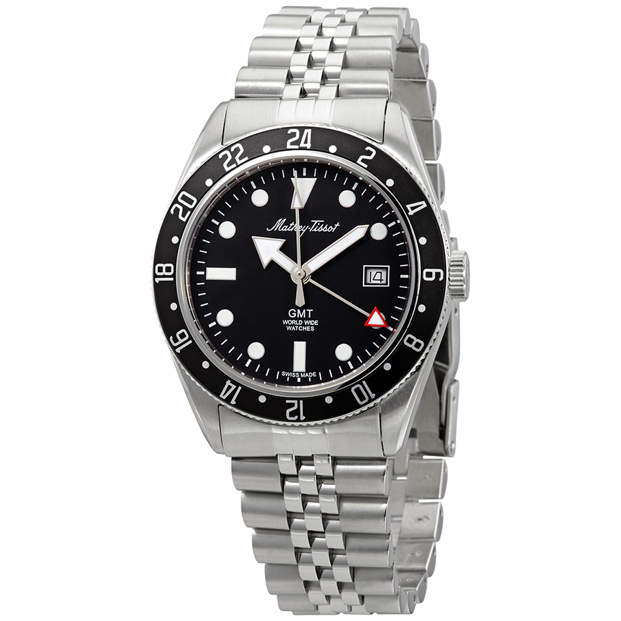 Silver-tone stainless steel case with a silver-tone stainless steel bracelet. Fixed with 24 hour time engraved black stainless steel bezel. Black dial with silver-tone hands and dot hour markers. Minute markers around the outer rim. Dial Type: Analog. Luminescent hands and markers. Date display at the 3 o'clock position. Ronda Caliber 515H24 quartz movement. Scratch resistant sapphire crystal. Pull / push crown. Solid case back. Round case shape, case size: 42 mm, case thickness: 9 mm. Band width: 20 mm. Deployment with push button release clasp. Water resistant at 50 meters / 165 feet. Functions: date, hour, minute, second, GMT. Casual watch style. Watch label: Swiss Movt. Mathey-Tissot Mathey Vintage GMT Quartz Black Dial Mens Watch H902AN.