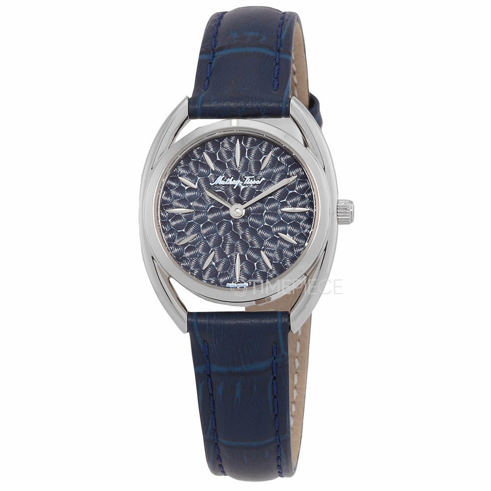 Silver-tone stainless steel case with a blue genuine leather strap. Fixed silver-tone stainless steel bezel. Blue dial with silver-tone hands and index hour markers. Dial Type: Analog. Ronda Caliber 762 quartz movement. Scratch resistant mineral crystal. Pull / push crown. Solid case back. Round case shape, case size: 28 mm. Tang clasp. Water resistant at 50 meters / 165 feet. Functions: hour, minute. Saphira Series. Casual watch style. Watch label: Swiss Made. Mathey-Tissot Saphira Quartz Blue Dial Ladies Watch D933ALBU.