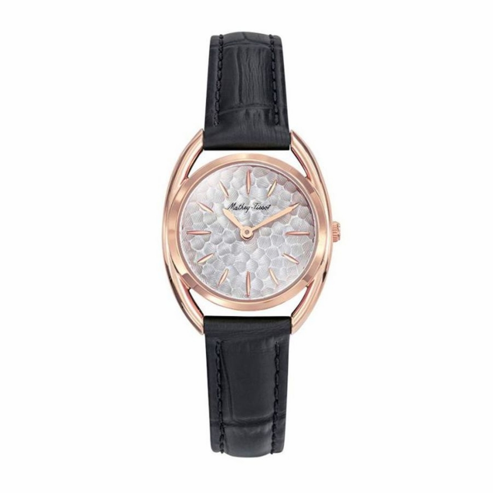 Rose gold-tone stainless steel case with a black genuine leather strap. Fixed rose gold-tone stainless steel bezel. Silver-tone dial with rose gold-tone hands and index hour markers. Dial Type: Analog. Ronda Caliber 762 quartz movement. Scratch resistant mineral crystal. Pull / push crown. Solid case back. Round case shape, case size: 28 mm. Tang clasp. Water resistant at 50 meters / 165 feet. Functions: hour, minute. Saphira Series. Casual watch style. Watch label: Swiss Made. Mathey-Tissot Saphira Quartz Silver Dial Ladies Watch D933PLI.