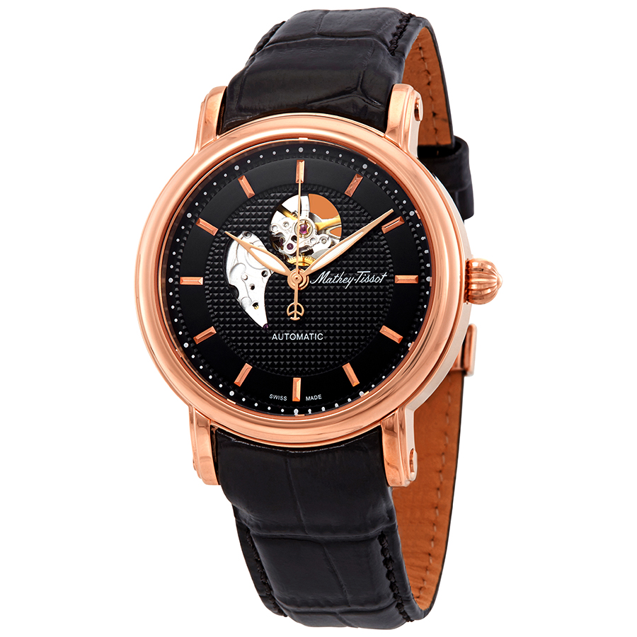 Rose gold PVD stainless steel case with a black leather strap. Fixed rose gold-tone bezel. Black (open heart) dial with luminous rose gold-tone leaf-style hands and index hour markers. Minute markers around the outer rim. Dial Type: Analog. Luminescent hands. Caliber STP 5-15 automatic movement, containing 26 Jewels, bitting at 28800 vph, and has a power reserve of approximately 44 hours. Scratch resistant sapphire crystal. Pull / push crown. Transparent case back. Round case shape. Case size: 43 mm. Case thickness: 13 mm. Band width: 22 mm. Deployment clasp. Water resistant at 50 meters / 165 feet. Functions: hour, minute, second. Additional Info: 26 rubies. Skeleton Series. Casual watch style. Watch label: Swiss Made. Mathey-Tissot Automatic Black Skeleton Dial Mens Watch H7051PN.