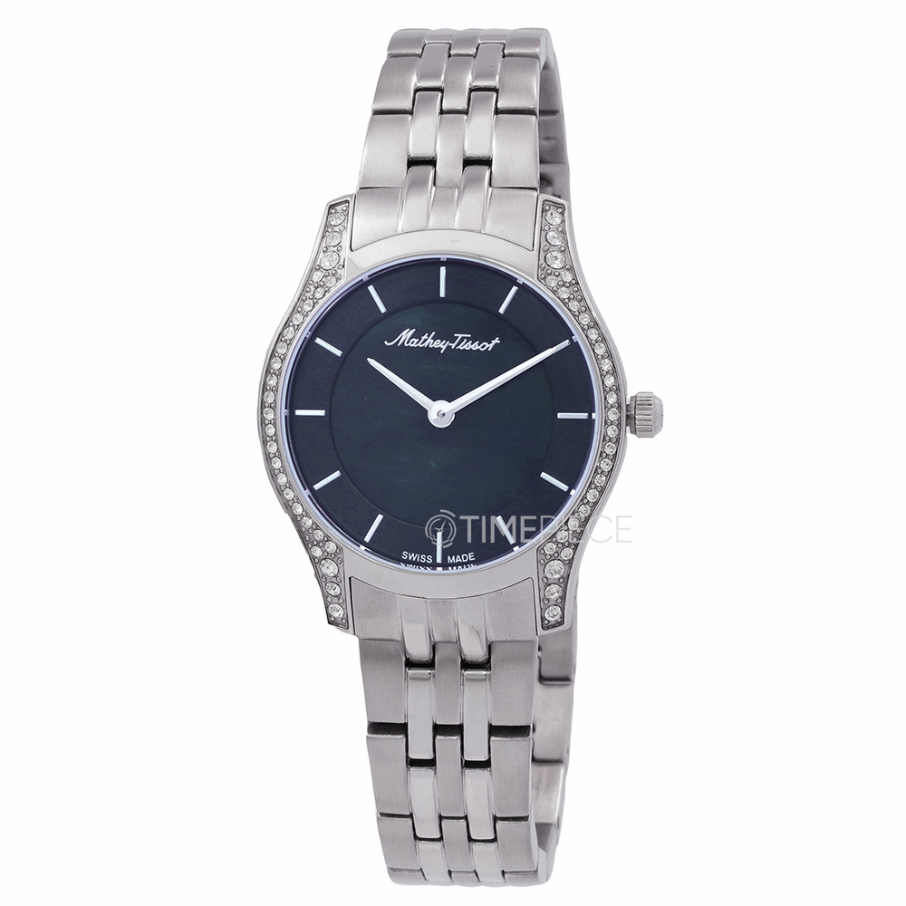 Silver-tone stainless steel case and bracelet. Fixed silver-tone zirconia set stainless steel bezel. White dial with silver-tone hands and index hour markers. Dial Type: Analog. Ronda Caliber 762 quartz movement. Scratch resistant mineral crystal. Pull / push crown. Solid case back. Round case shape, case size: 32 mm. Fold over clasp with a safety release. Water resistant at 50 meters / 165 feet. Functions: hour, minute. Additional Info: zirconia. Tacy Series. Casual watch style. Watch label: Swiss Made. Mathey-Tissot Tacy Quartz White Dial Ladies Watch D949AQN.