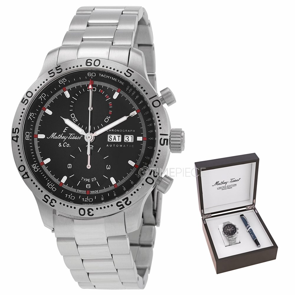 Silver-tone stainless steel 316L case and bracelet. Silver-tone bezel. Black dial with silver-tone hands and index hour markers. Minute markers around the outer rim, tachymeter scale around the inner rim. Dial Type: Analog. Date display at the 3 o'clock position. 12 hours, 30 minutes subdials. Caliber Peseux P350 automatic movement with a 38-hour power reserve. Scratch resistant sapphire crystal. Pull / push crown. Transparent see through case back. Round case shape, case size: 44 mm, case thickness: 11 mm. Water resistant at 50 meters / 165 feet. Functions: date, day, hour, minute, second. Type 23 Series. Watch label: Swiss Made. Mathey-Tissot Type 23 Automatic Black Dial Mens Watch H1823CHATN.
