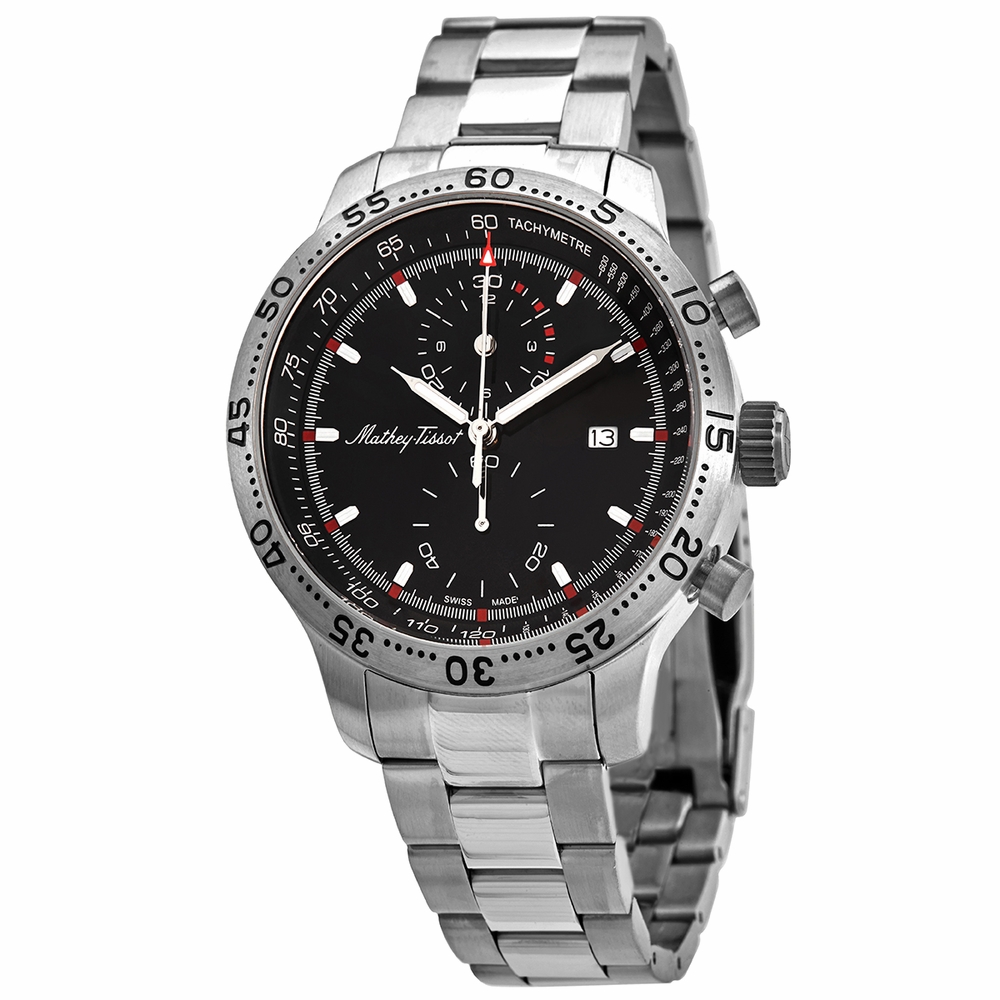 Silver-tone stainless steel case and bracelet. Fixed bezel. Black dial with silver-tone hands and index hour markers. Tachymeter. Dial Type: Analog. Luminescent hands and markers. Date display at the 3 o'clock position. Chronograph - two sub-dials displaying: 60 second and 30 minute. RONDA CHRONO 3520D quartz movement. Scratch resistant sapphire coated crystal. Pull / push crown. Round case shape, case size: 44 mm. Water resistant at 50 meters / 165 feet. Functions: chronograph, date, hour, minute, second. Type 23 Chrono Series. Watch label: Swiss Made. Mathey-Tissot Type 23 Chrono Quartz Black Dial Mens Watch H1823CHAN.