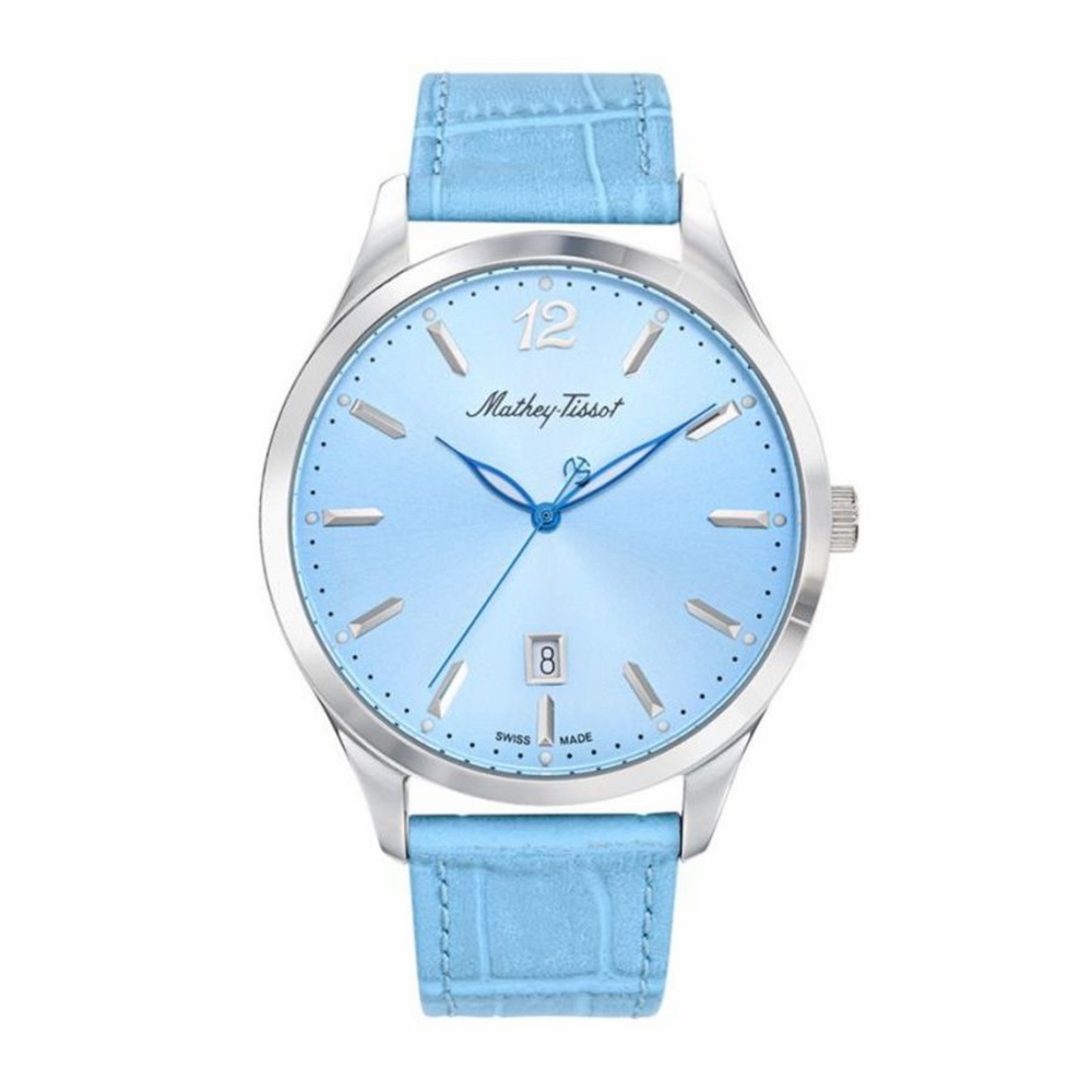Silver-tone stainless steel case with a blue genuine leather strap. Fixed silver-tone stainless steel bezel. Blue dial with blue hands and Arabic numeral & index hour markers. Minute markers around the outer rim. Dial Type: Analog. Luminescent hands and markers. Date display at the 6 o'clock position. Ronda Caliber 515.H6 quartz movement. Scratch resistant mineral crystal. Pull / push crown. Solid case back. Round case shape, case size: 42 mm. Tang clasp. Water resistant at 50 meters / 165 feet. Functions: date, hour, minute, second. Urban Series. Casual watch style. Watch label: Swiss Made. Mathey-Tissot Urban Quartz Blue Dial Mens Watch H411SKY.