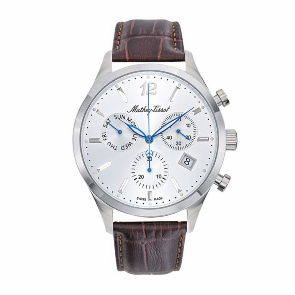 Silver-tone stainless steel case with a brown leather strap. Fixed silver-tone stainless steel bezel. Silver-tone dial with blue hands and Arabic numeral & index hour markers. Minute markers around the outer rim. Dial Type: Analog. Luminescent hands. Date display at the 4 o'clock position. Three sub-dials displaying: day, 60 second and 30 minute. Ronda Caliber Z60 quartz movement. Scratch resistant mineral crystal. Pull / push crown. Solid case back. Round case shape, case size: 42 mm. Tang clasp. Water resistant at 50 meters / 165 feet. Functions: chronograph, date, day, hour, minute, small second. Urban Chrono Series. Casual watch style. Watch label: Swiss Made. Mathey-Tissot Urban Chrono Chronograph Quartz Silver Dial Mens Watch H411CHALS.