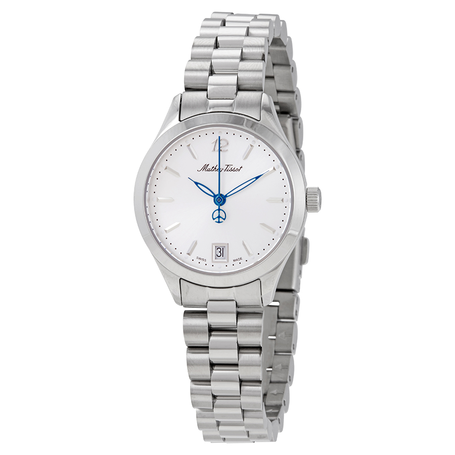 316L stainless steel case with a 316L stainless steel bracelet. Fixed stainless steel bezel. Silver dial with luminous blue hands and index hour markers. An Arabic numeral appears at the 12 o'clock position. Minute markers around the outer rim. Dial Type: Analog. Luminescent hands and markers. Date display at the 6 o'clock position. Ronda caliber 585 H6 quartz movement. Scratch resistant sapphire crystal. Pull / push crown. Solid case back. Round case shape. Case size: 30 mm. Case thickness: 4 mm. Band width: 20 mm. Fold over clasp. Water resistant at 50 meters / 165 feet. Functions: date, hour, minute, second. Casual watch style. Watch label: Swiss Made. Mathey-Tissot Urban Quartz Silver Dial Ladies Watch D411MAS.