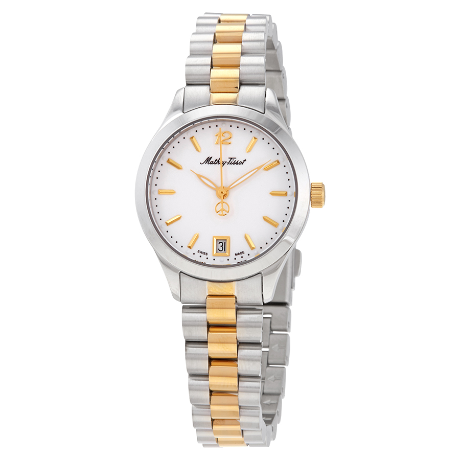 Silver-tone stainless steel case with a two-tone (silver-tone and yellow gold-tone) stainless steel bracelet. Fixed silver-tone stainless steel bezel. White dial with luminous yellow gold-tone leaf-style shape hands and index hour markers. Arabic numeral appears at the 12 o'clock positions. minute markers around the outer rim. Dial Type: Analog. Luminescent hands and markers. Date display at the 6 o'clock position. Ronda Caliber 585 h6 quartz movement. Scratch resistant sapphire crystal. Pull / push crown. Solid case back. Round case shape, case size: 30 mm, case thickness: 4 mm. Fold over clasp. Water resistant at 50 meters / 165 feet. Functions: date, hour, minute, second. Urban series. Dress watch style. Watch label: Swiss Made. Mathey-Tissot Urban White Dial Two-tone Ladies Watch D411MBI.