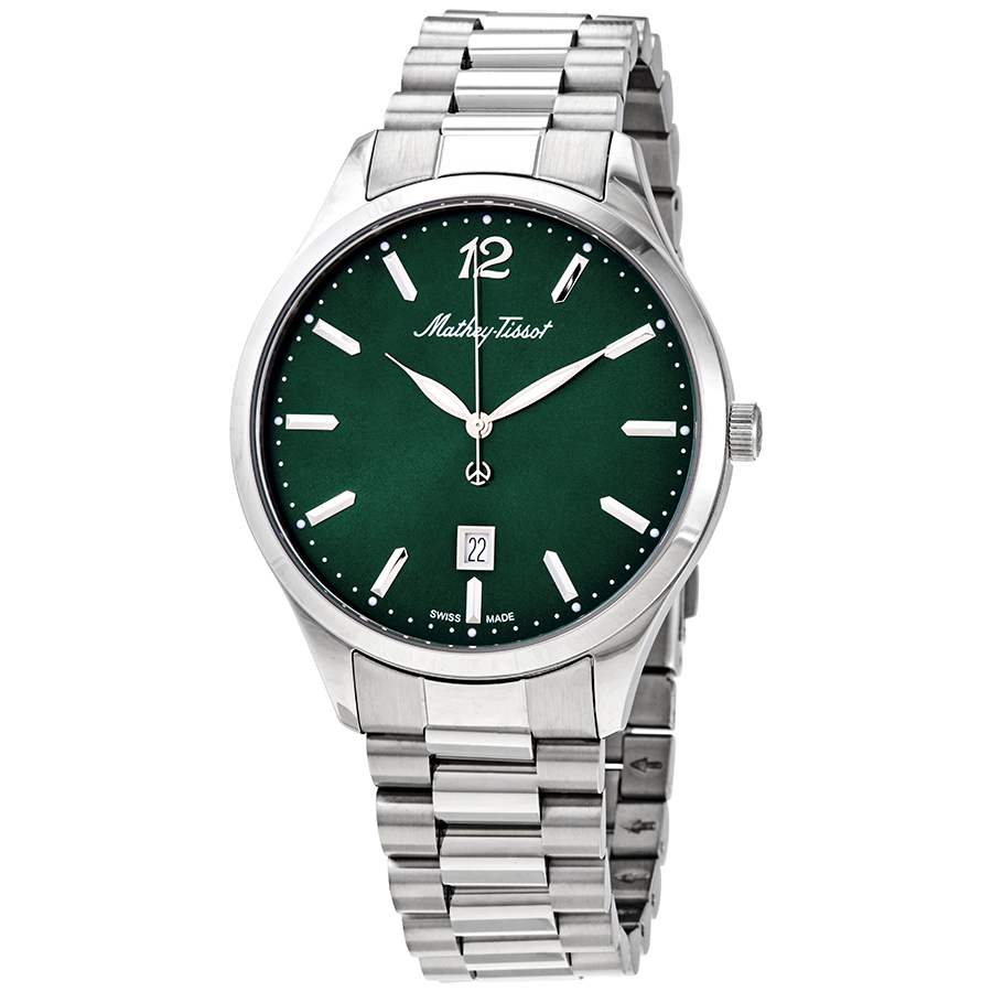 316L stainless steel case with a 316L stainless steel bracelet. Fixed stainless steel bezel. Green dial with luminous silver-tone leaf-style hands and index hour markers. An Arabic numeral appears at the 12 o'clock position. Minute markers around the outer rim. Dial Type: Analog. Luminescent hands and markers. Date display above the 6 o'clock position. Ronda caliber 515.H6 quartz movement. Scratch resistant sapphire crystal. Pull / push crown. Solid case back. Round case shape. Case size: 42 mm. Case thickness: 8 mm. Band width: 20 mm. Fold over clasp with a push button release. Water resistant at 50 meters / 165 feet. Functions: date, hour, minute, second. Urban Series. Casual watch style. Watch label: Swiss Made. Mathey-Tissot Urban Quartz Green Dial Mens Watch H411MAV.