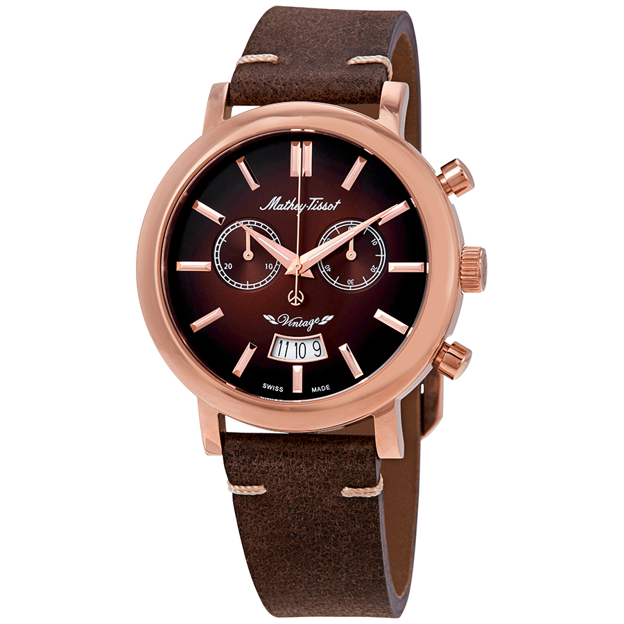 Rose gold PVD stainless steel case with a brown leather strap. Fixed rose gold PVD bezel. Brown dial with luminous rose gold-tone hands and index hour markers. Dial Type: Analog. Luminescent hands and markers. Date display at the 6 o'clock position. Chronograph - two sub-dials displaying: 60 second and 30 minute. Ronda Chrono 5021 quartz movement. Scratch resistant sapphire crystal. Pull / push crown. Solid case back. Round case shape. Case size: 42 mm./ Case thickness: 5 mm. Band width: 20 mm. Tang clasp. Water resistant at 50 meters / 165 feet. Functions: chronograph, date, hour, minute, second. Casual watch style. Watch label: Swiss Made. Mathey-Tissot Vintage Chronograph Brown Dial Mens Watch H42CHRF.