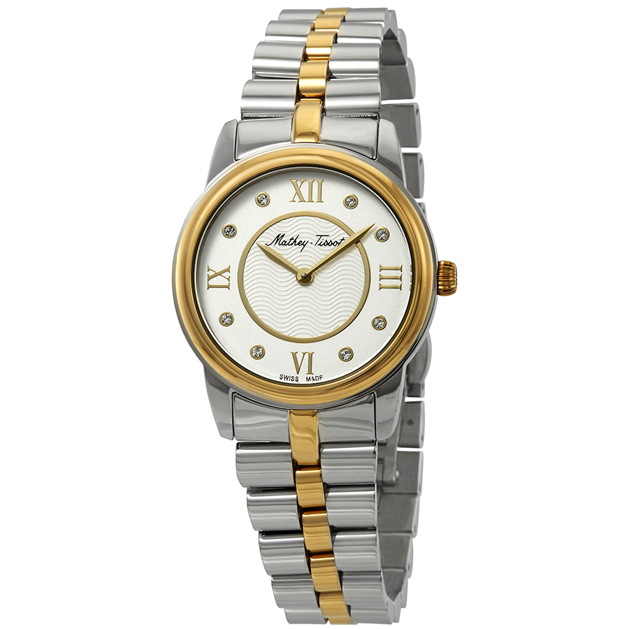 Silver-tone stainless steel case with a two-tone (silver-tone and yellow gold PVD) stainless steel bracelet. Fixed yellow gold PVD stainless steel bezel. White dial with gold-tone hands and Roman numeral and crystal hour markers. Dial Type: Analog. Ronda Caliber 1062 quartz movement. Scratch resistant sapphire crystal. Pull / push crown. Solid case back. Round case shape, case size: 32 mm, case thickness: 7 mm. Butterfly buckle clasp. Water resistant at 30 meters / 100 feet. Functions: hour, minute. Dress watch style. Watch label: Swiss Made. Mathey-Tissot Artemis Crystal White Dial Ladies Watch D1086BYI.