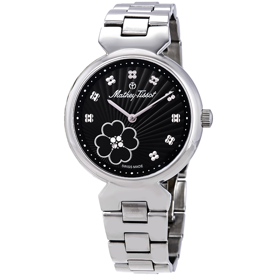 Stainless steel case with a stainless steel bracelet. Fixed stainless steel bezel. Black (crystal-centered flower motif) dial with silver-tone hands and index hour markers. Minute markers around the outer rim. Dial Type: Analog. Ronda Caliber 762 quartz movement. Scratch resistant sapphire crystal. Pull / push crown. Solid case back. Round case shape. Case size: 32 mm. Case thickness: 8 mm. Bracelet width: 17 mm. Butterfly clasp. Water resistant at 50 meters / 165 feet. Functions: hour, minute. Dress watch style. Watch label: Swiss Made. Mathey-Tissot Fiore Black Dial Ladies Watch D1089AN.