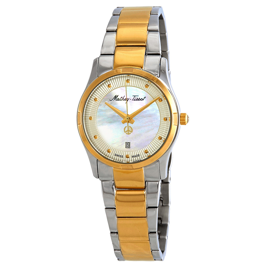 Silver-tone stainless steel case with a two-tone (silver-tone and gold-tone PVD) stainless steel bracelet. Fixed gold-tone PVD stainless steel bezel. White dial with gold-tone hands and dot hour markers. Dial Type: Analog. Date display at the 6 o'clock position. Ronda Caliber 515 quartz movement. Scratch resistant sapphire crystal. Pull / push crown. Solid case back. Round case shape, case size: 30 mm, case thickness: 8 mm. Band width: 17 mm. Butterfly buckle clasp. Water resistant at 50 meters / 165 feet. Functions: date, hour, minute, second. Dress watch style. Watch label: Swiss Made. Mathey-Tissot Elisa White Dial Ladies Watch D2111BI2.