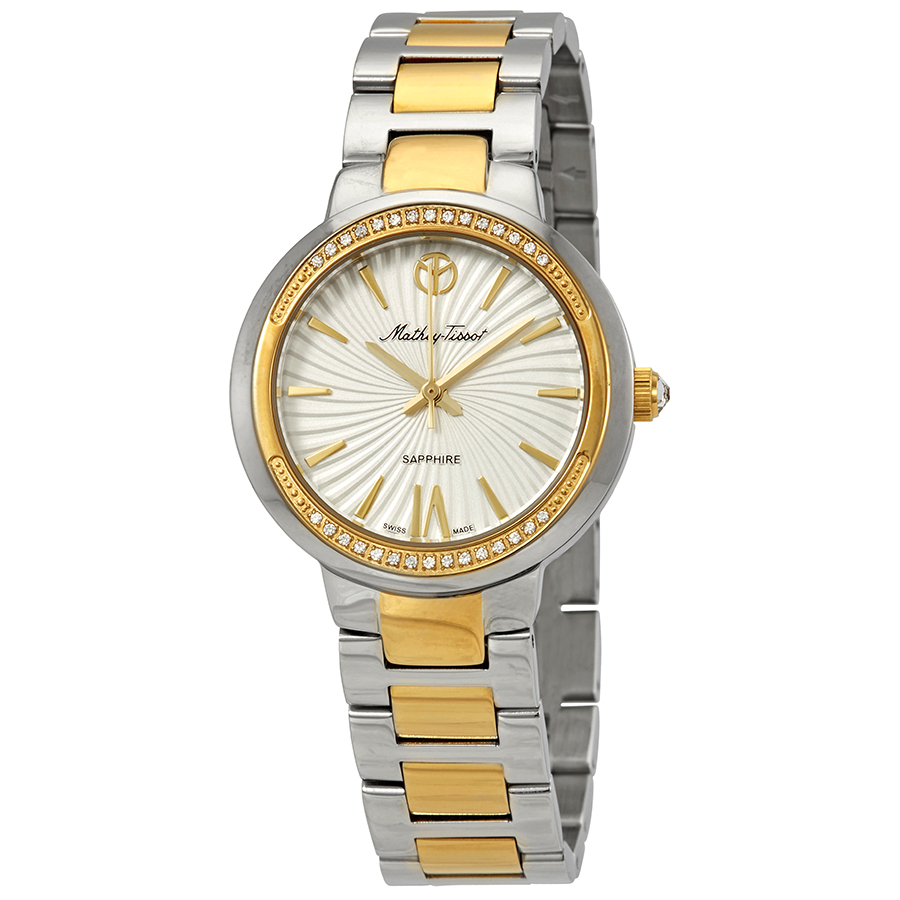 Silver-tone stainless steel case with a two-tone (silver-tone and yellow gold PVD) stainless steel bracelet. Fixed yellow gold PVD crystal set bezel. White dial with gold-tone hands and Roman numeral and index hour markers. Minute markers around the outer rim. Dial Type: Analog. Ronda Caliber 763 quartz movement. Scratch resistant sapphire crystal. Pull / push crown. Solid case back. Round case shape, case size: 36 mm, case thickness: 6 mm. Deployment buckle clasp. Water resistant at 50 meters / 165 feet. Functions: hour, minute, second. Dress watch style. Watch label: Swiss Made. Mathey-Tissot Lucrezia Crystal White Dial Ladies Watch D3082BA.