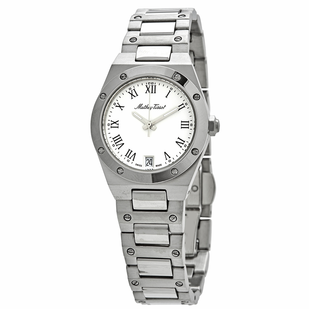 Silver-tone stainless steel case with a silver-tone stainless steel bracelet. Fixed silver-tone stainless steel bezel. White dial with silver-tone hands and Roman numeral hour markers. Minute markers around the outer rim. Dial Type: Analog. Luminescent hands. Date display at the 6 o'clock position. Ronda Caliber 515 quartz movement. Scratch resistant sapphire crystal. Screw down crown. Solid case back. Round case shape, case size: 30 mm, case thickness: 5 mm. Deployment clasp. Water resistant at 50 meters / 165 feet. Functions: date, hour, minute, second. Casual watch style. Watch label: Swiss Made. Mathey-Tissot Elisir White Dial Ladies Watch D680ABR.