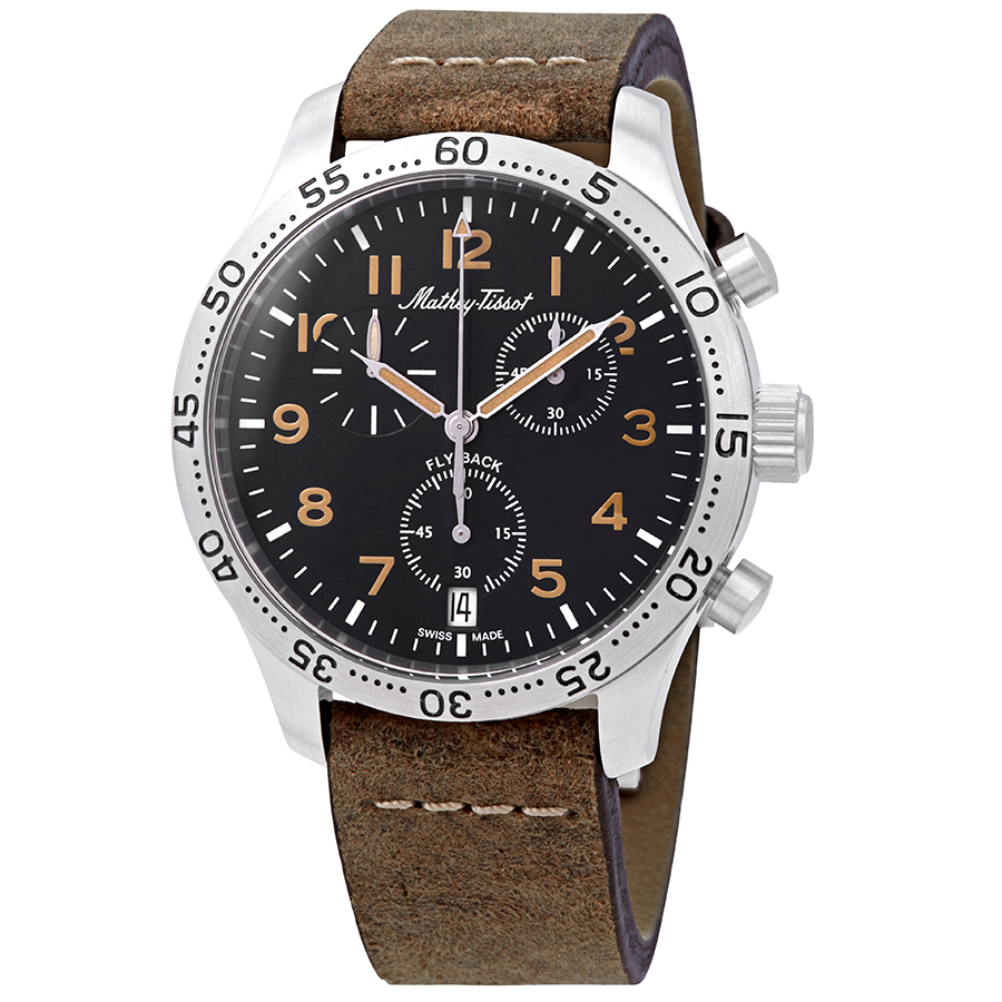 Stainless steel case with a brown leather strap. Fixed stainless steel bezel. Black dial with luminous silver-tone hands and Arabic numeral hour markers. Minute markers around the outer rim. Dial Type: Analog. Luminescent hands. Date display at the 6 o'clock position. Chronograph - three sub-dials displaying: 60 second, 60 minute and 12 hour. ETA caliber G10 212 AN quartz movement. Scratch resistant sapphire crystal. Pull / push crown. Solid case back. Round case shape. Case size: 42 mm. Case thickness: 11 mm. Band width: 20 mm. Fold over clasp with a push button release. Water resistant at 50 meters / 165 feet. Functions: chronograph, flyback, date, hour, minute, second. Flyback Type 21 Series. Sport watch style. Watch label: Swiss Made. Mathey-Tissot Flyback Type 21 Chronograph Black Dial Mens Watch H1821CHALNO.