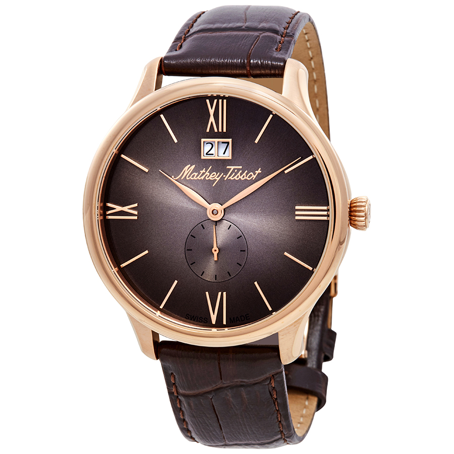 Rose gold-tone stainless steel case with a brown leather strap. Fixed rose gold-tone stainless steel bezel. Brown dial with rose gold-tone leaf-style shape hands and Roman numeral and index hour markers. Dial Type: Analog. Date display at the 12 o'clock position. One subdial displaying: small second. Ronda Caliber 505 H6 quartz movement. Scratch resistant sapphire crystal. Pull / push crown. Solid case back. Round case shape, case size: 42 mm, case thickness: 5 mm. Buckle clasp. Water resistant at 50 meters / 165 feet. Functions: big date, hour, minute, small second. Edmond Quartz Series. Casual watch style. Watch label: Swiss Made. Mathey-Tissot Edmond Quartz Brown Dial Mens Watch H1886QPM.