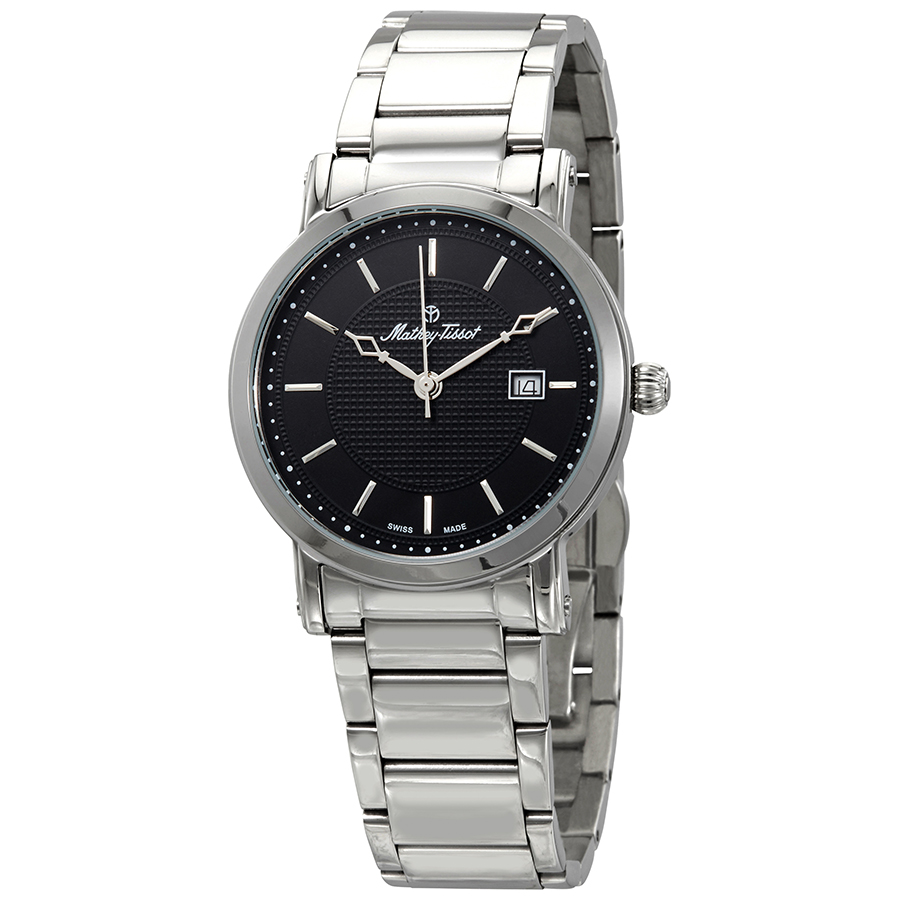 Silver-tone stainless steel case with a silver-tone stainless steel bracelet. Fixed silver-tone stainless steel bezel. Black dial with silver-tone hands and index hour markers. Minute markers around the outer rim. Dial Type: Analog. Date display at the 3 o'clock position. Quartz movement. Scratch resistant mineral crystal. Pull / push crown. Solid case back. Round case shape, case size: 38 mm, case thickness: 7.3 mm. Deployment clasp. Water resistant at 30 meters / 100 feet. Functions: date, hour, minute, second. Casual watch style. Watch label: Swiss Made. Mathey-Tissot City Metal Black Dial Mens Watch H611251MAN.