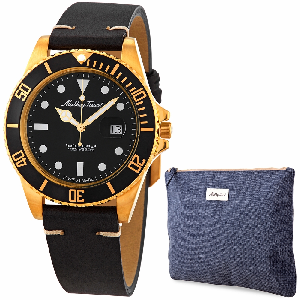 Gold-tone stainless steel case with a black leather strap. Black bezel. Black dial with gold-tone hands and dot hour markers. Minute markers around the outer rim. Dial Type: Analog. Date display at the 3 o'clock position. Quartz movement. Solid case back. Round case shape. Case size: 42 mm. Water resistant at 100 meters / 330 feet. Functions: date, hour, minute, second. Watch label: Swiss Made. Mathey-Tissot Mathey Vintage Quartz Black Dial Mens Watch H9010PLN.