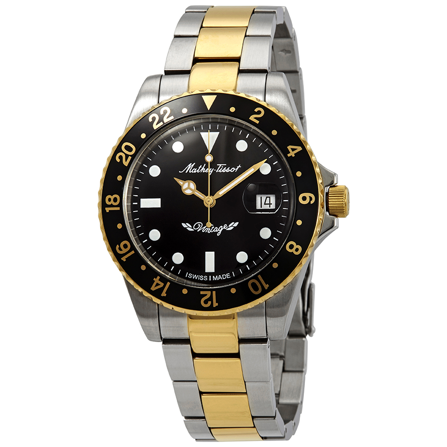 Silver-tone stainless steel case with a two-tone (silver-tone and yellow gold PVD) stainless steel bracelet. Uni-directional rotating black stainless steel bezel. Black dial with gold-tone hands and index hour markers. Minute markers around the outer rim. Dial Type: Analog. Luminescent hands and markers. Date display at the 3 o'clock position. Sellita Caliber SW 200 automatic movement with a 38-hour power reserve. Sapphire glass scratch anti resistant crystal. Screw down crown. Transparent case back. Round case shape, case size: 42 mm, case thickness: 10 mm. Band width: 20 mm. Deployment buckle clasp. Water resistant at 100 meters / 330 feet. Functions: date, hour, minute, second. Additional Info: suitable for everyday use and swimming but not suitable for snorkeling or water sports. Casual watch style. Watch label: Swiss Made. Mathey-Tissot Mathey Vintage Automatic Black Dial Mens Watch H901ATBN.
