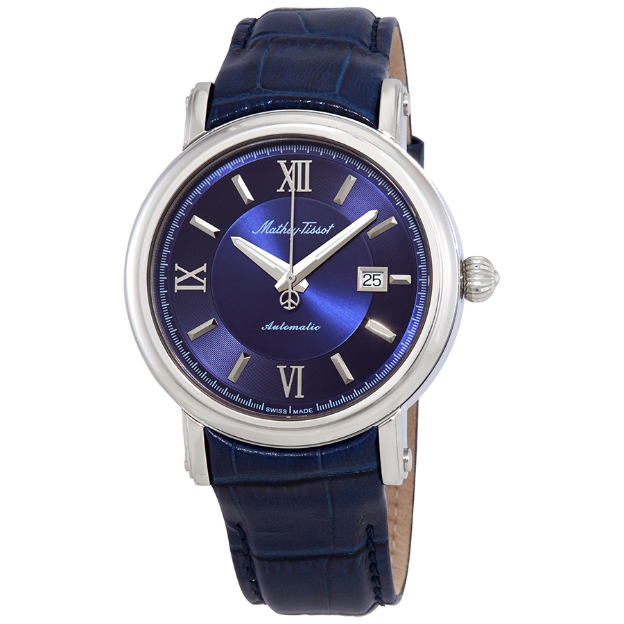 Silver-tone stainless steel case with a blue leather strap. Fixed silver-tone stainless steel bezel. Blue dial with silver-tone hands and Roman numeral and index hour markers. Minute markers around the outer rim. Dial Type: Analog. Luminescent hands and markers. Date display at the 3 o'clock position. Sellita Caliber SW 200 Automatic movement, based upon ETA 2824-2, containing 26 Jewels, bitting at 28800 vph, and has a power reserve of approximately 38 hours. Scratch resistant sapphire crystal. Pull / push crown. Transparent case back. Round case shape, case size: 43 mm, case thickness: 10 mm. Band width: 22 mm. Buckle clasp. Water resistant at 50 meters / 165 feet. Functions: date, hour, minute, second. Casual watch style. Watch label: Swiss Made. Mathey-Tissot Renaissance Automatic Blue Dial Mens Watch H9030ABU.