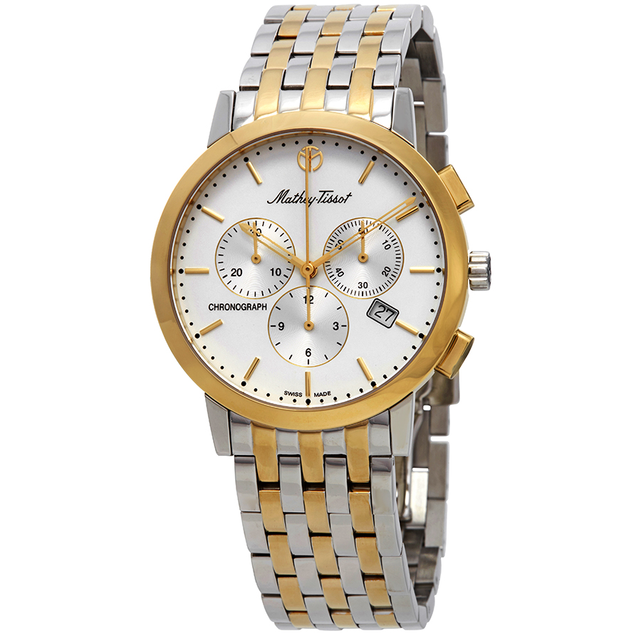 Rose gold-tone stainless steel case with a two-tone (silver-tone and rose gold-tone) stainless steel bracelet. Fixed gold-tone stainless steel bezel. Silver-tone dial with gold-tone hands and index hour markers. Minute markers around the outer rim. Dial Type: Analog. Date display at the 4 o'clock position. Chronograph - three sub-dials displaying: 60 second, 30 minute and 12 hour. Ronda Caliber 5030.D quartz movement. Scratch resistant sapphire crystal. Pull / push crown. Solid case back. Round case shape, case size: 40 mm, case thickness: 6 mm. Water resistant at 50 meters / 165 feet. Functions: chronograph, date, hour, minute, small second. Sport watch style. Watch label: Swiss Made. Mathey-Tissot Sport Classic Chronograph Silver Dial Mens Watch H9315CHBI.